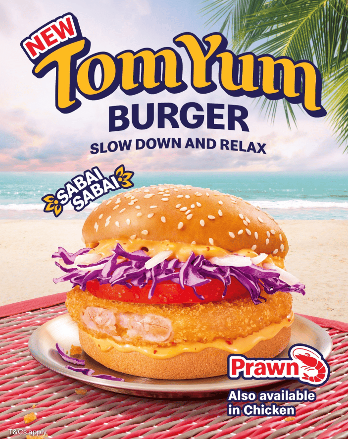 • Features prawn or chicken patty with crisp veggies and a spicy Tom Yum Mayo Sauce.
